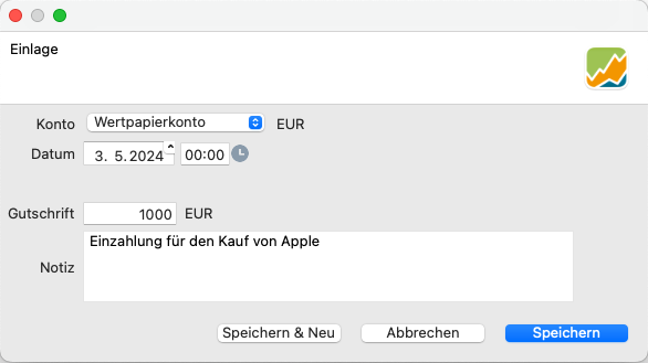 Die Erfassung einer Einzahlung ist ein einfacher Vorgang (siehe Abbildung 1). Gib das Einzahlungskonto, das Transaktionsdatum, den Betrag und optional eine Notiz dazu ein.