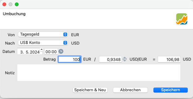 Um eine Einzahlung in einer bestimmten Währung zu veranlassen, navigierst Du zum entsprechenden Konto. Stammdaten > Konto. Vergewissere Dich, dass das gewählte Konto dieselbe Währung hat wie die Einzahlung. Um Geldbeträge zwischen Konten zu transferieren, sei es in der gleichen Währung oder in verschiedenen Währungen (unter Verwendung der von der EZB bereitgestellten Wechselkurse), benutzt Du Kontextmenü > Umbuchung.