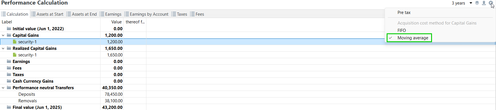 To accurately assess realized and unrealized gains after the sale of a security, the sold amount and the remaining market value must be compared against the acquisition cost of the security. While this is straightforward in the case of a single purchase followed by a sale, various definitions and methodologies apply when multiple purchases and sales occur at different prices. Portfolio Performance calculates gains using two methodologies: