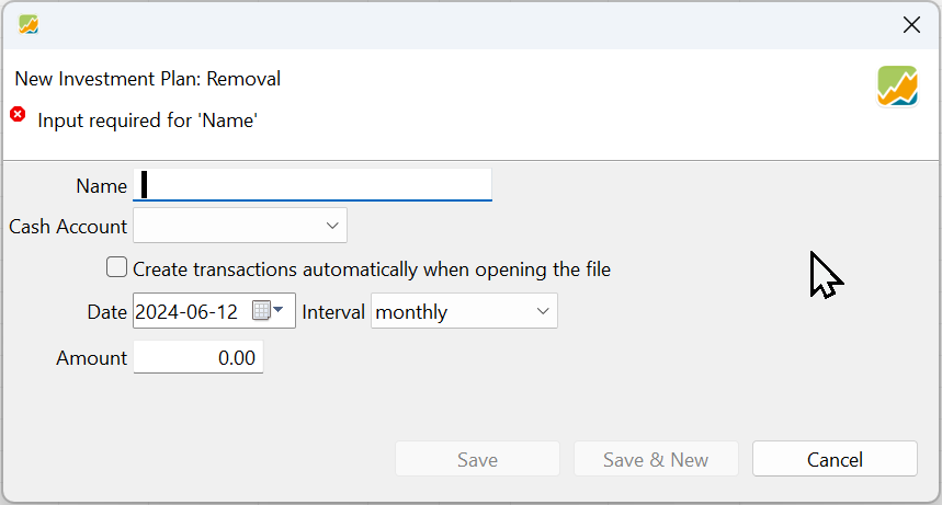 Once you click the Save button, the information will be added to the main pane of the investment plans (as shown in Figure 1), but the plan will not be executed immediately. No transactions will be performed at this stage. However, if you have checked the Create transactions automatically when opening the file, the plan will be executed automatically the next time you open the file.