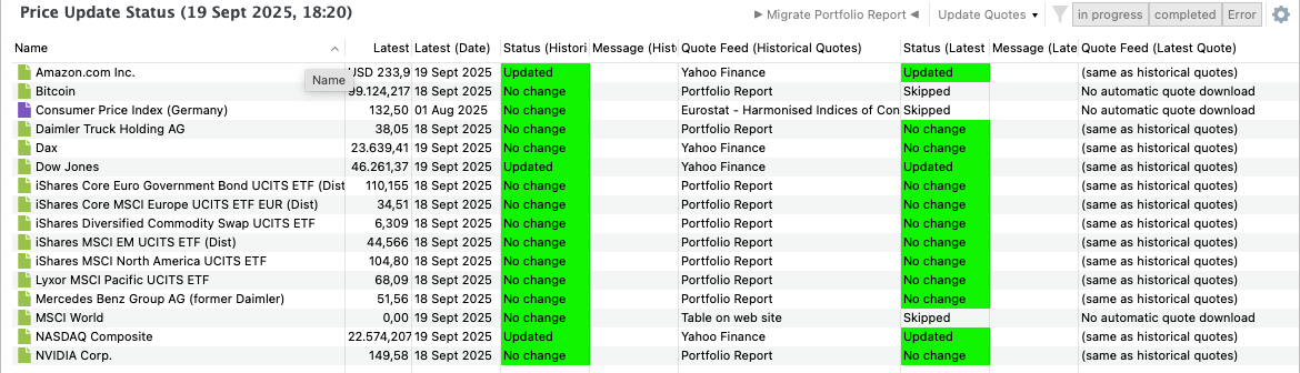 The next six columns display the status, the feed, and any error messages related to the update process for both historical prices and the latest quote. The status can be:
